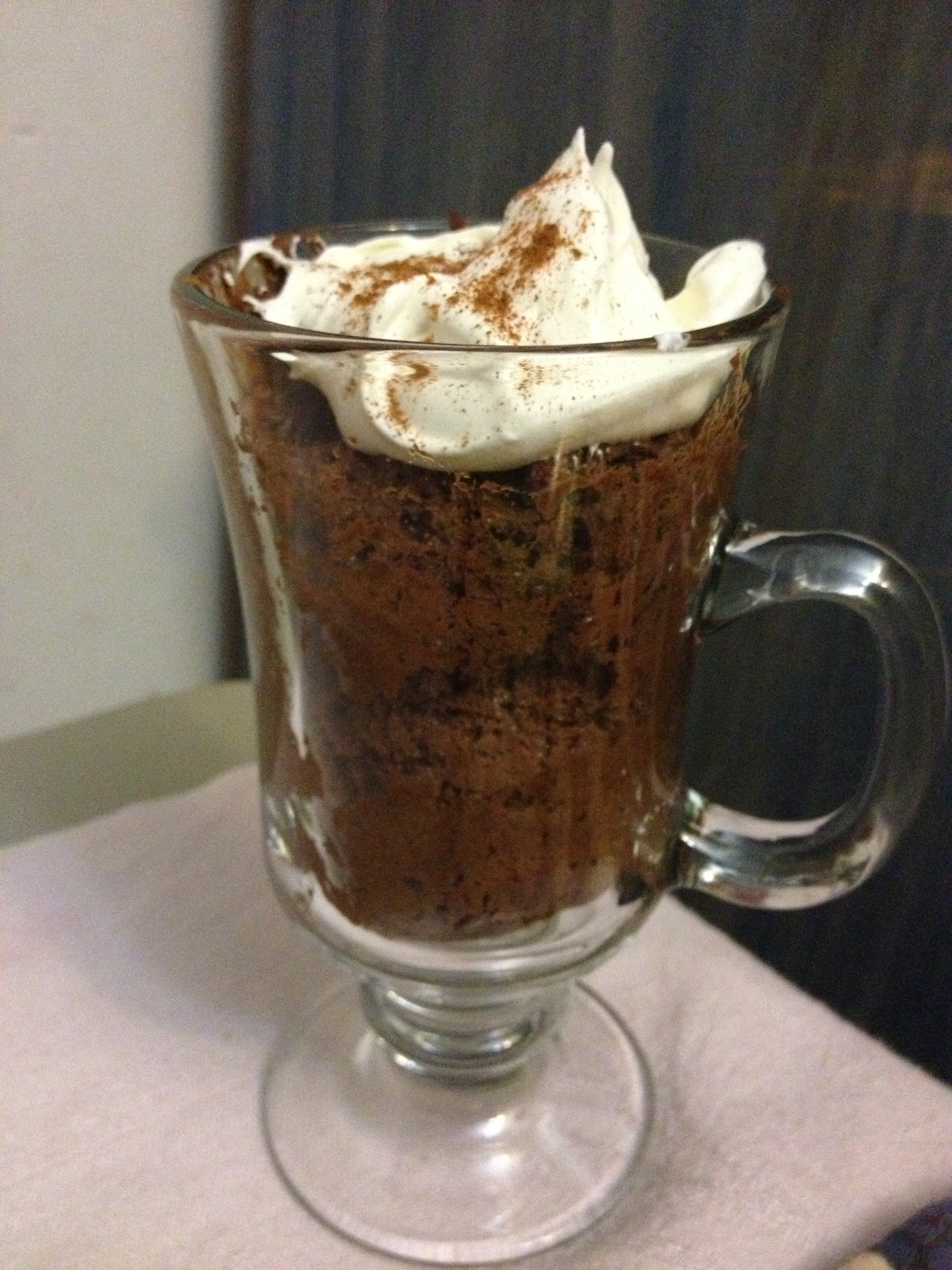 This is definitely a keeper!!! My official recipe testers loved it and some were disappointed there were no seconds. I served it with whipped cream and a dash of cinnamon, though a dash of cocoa would have worked nicely too. It was very light but yet dense with chocolate, if that even makes sense. My palate was in heaven.